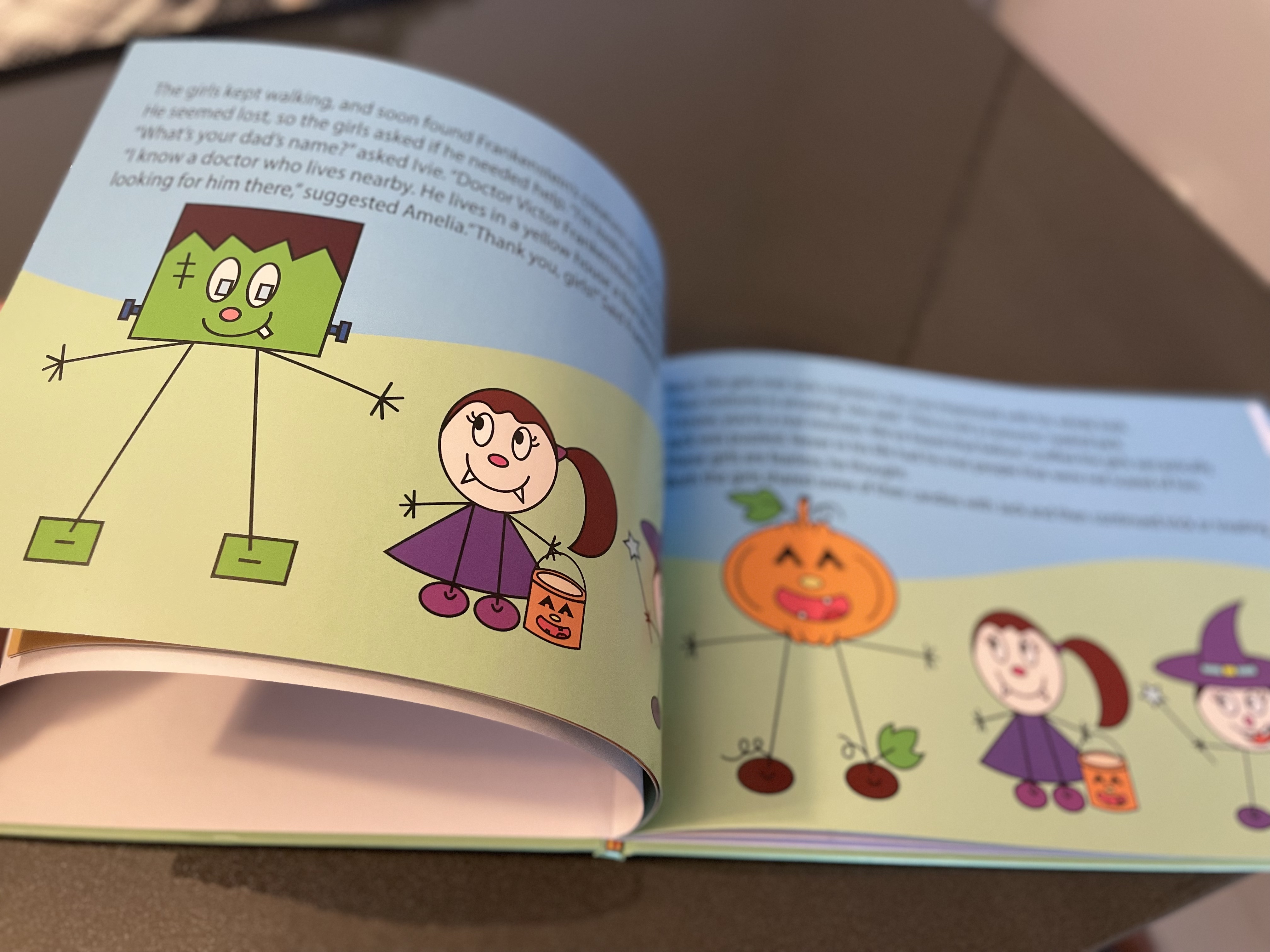 A Halloween Night to Remember: Our story begins on Halloween night in Flucos’ city when a portal to another world opens, releasing real monsters into the unsuspecting town. As Ivie and Amelia set out on their trick-or-treating adventure, they encounter various monsters, including Dracula, Frankenstein’s creature, Jack O’Lantern, and a good witch. Unaware that they are real monsters, the girls engage with them light-hearted and courageously, appreciating their impressive “costumes” and sharing candies with them.